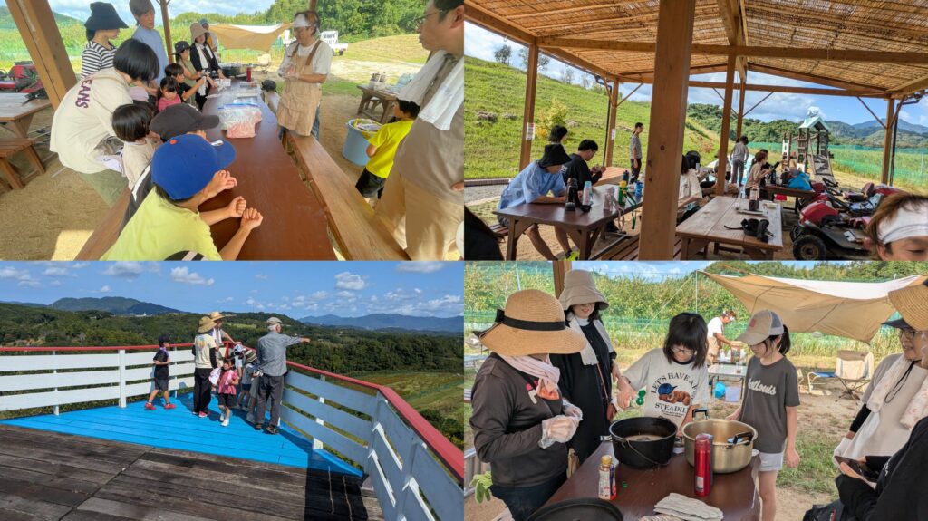 自称プロキャンパーラビットさんを招いて、30人近くの親子がハンバーグ、焼きおにぎり、ダッジオーブンで炊き込みご飯を作りました。皆でドームテントを張ったり、自分でハンバーグを丸めて焼いたり、トラックの荷台に乗って展望台まであがったり、自然の中でのキャンプを楽しんでいました。